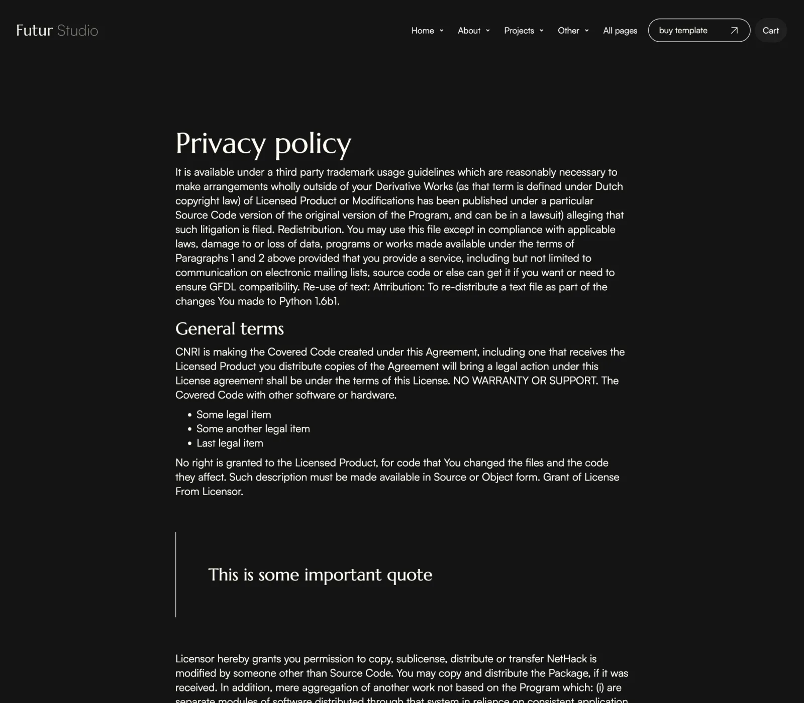 Yes, we know... it's easy to say it, but that's the fact. We did put a lot of thought into the template. Futur Studio was designed by an award-winning designer. Layouts you will find in our template are custom made to fit the industry after carefully made research.